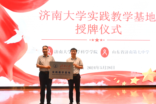 在济南第七中学报告厅举行了实践教学基地揭牌仪式。济南第七中学校长刘汉路、办公室主任李静、数学组教研组长程凤霞、自慰高潮