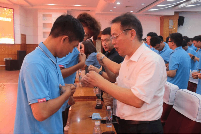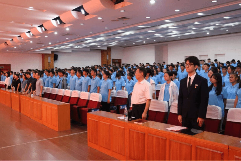 新生见面会在庄严的国歌声中拉开帷幕,全体师生起立,以崇高的敬意奏唱国歌。