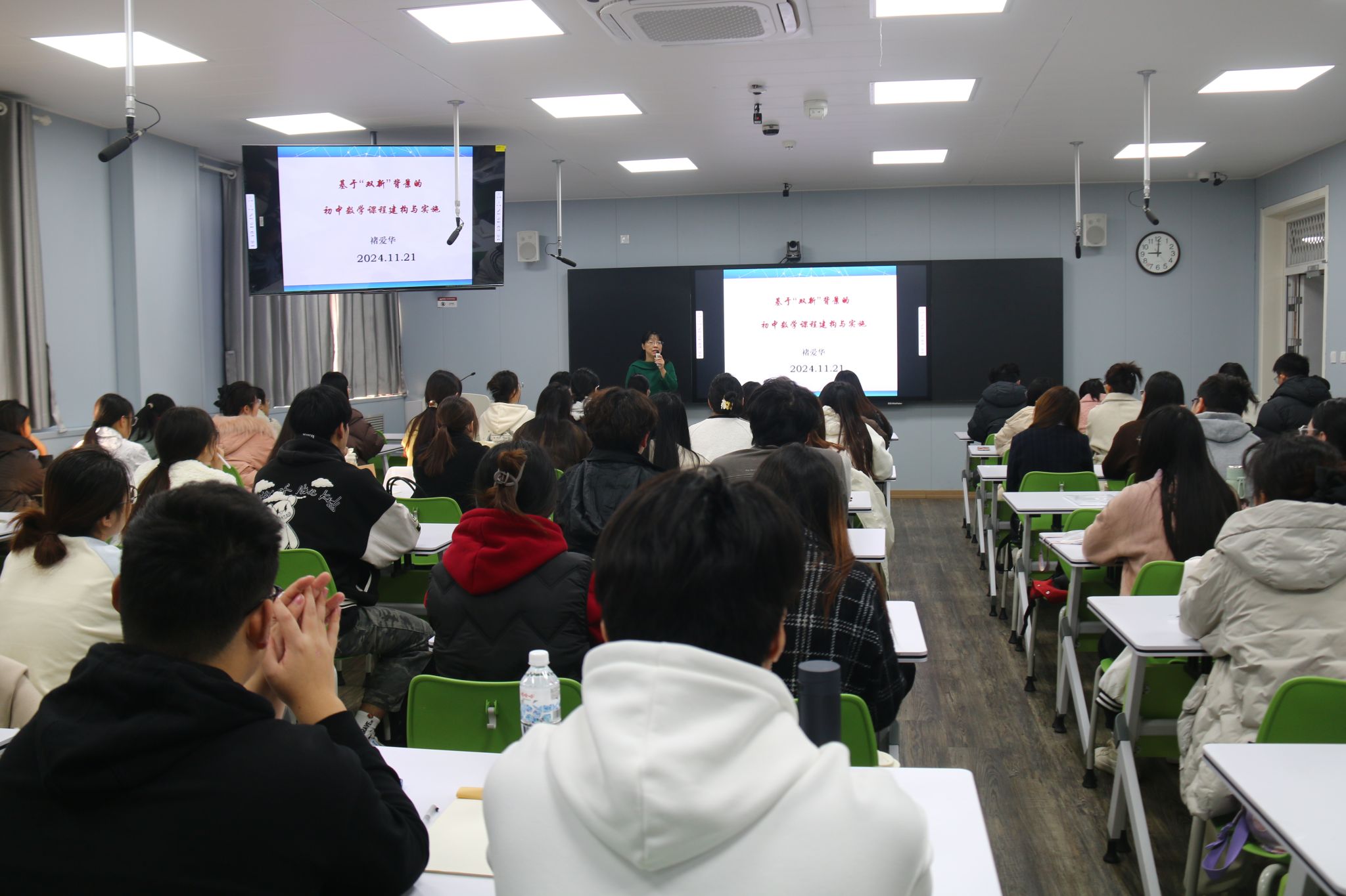 报告采用“专家讲座+小组讨论+互动答疑”的形式,褚爱华以“基于‘双新’背景的初中数学课程建构与实施”为主题,结合自己多年教学实践深刻剖析了“双新”背景下初中数学课程构建与实施的重要性及其面临的挑战。她指出,随着教育改革的持续推进,中学数学教育正步入一个机遇与挑战并存的新阶段,并针对当前中学数学教学中存在的突出问题和“双新”背景下对中学数学教育的新要求进行了全面探讨。同时,她从落实新课标、渗透核心素养、融入数学文化以及建构多维数学课程等多个维度,通过深入浅出的案例分析,详细阐述了相关的应对策略和实施建议。报告结束后,同学们分组进行研讨交流,深化对讲座内容的理解与运用,现场氛围热烈。褚爱华针对现场提出的问题一一作出解答,并鼓励同学们将学习专业知识与深入教育教学实践相结合。