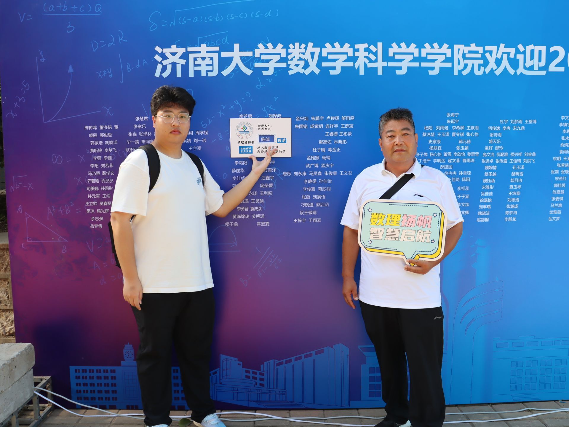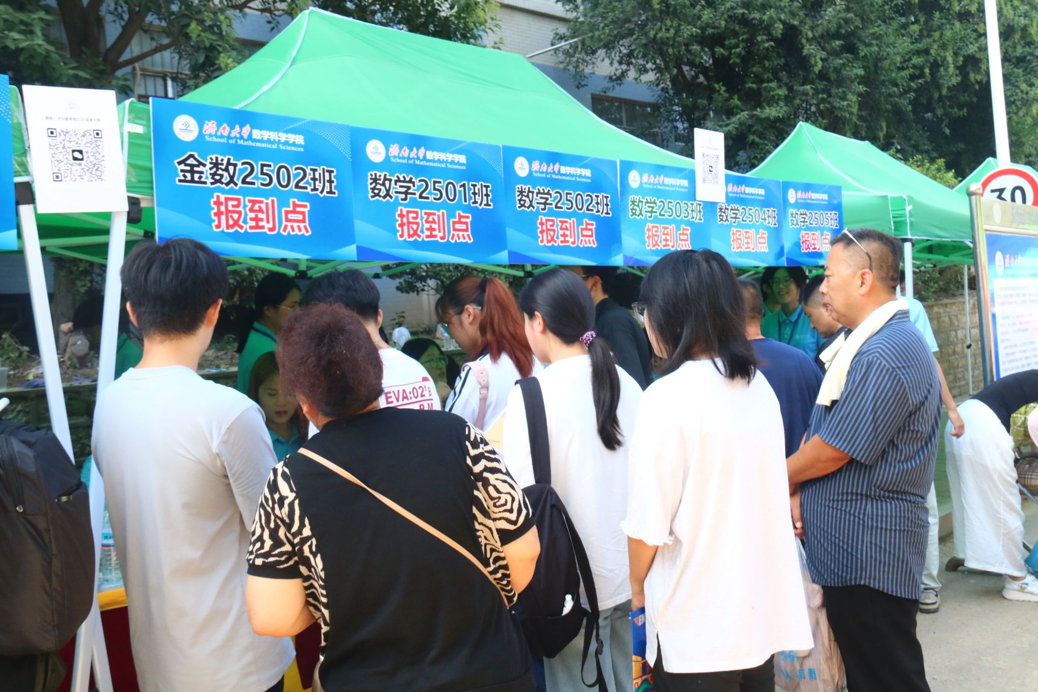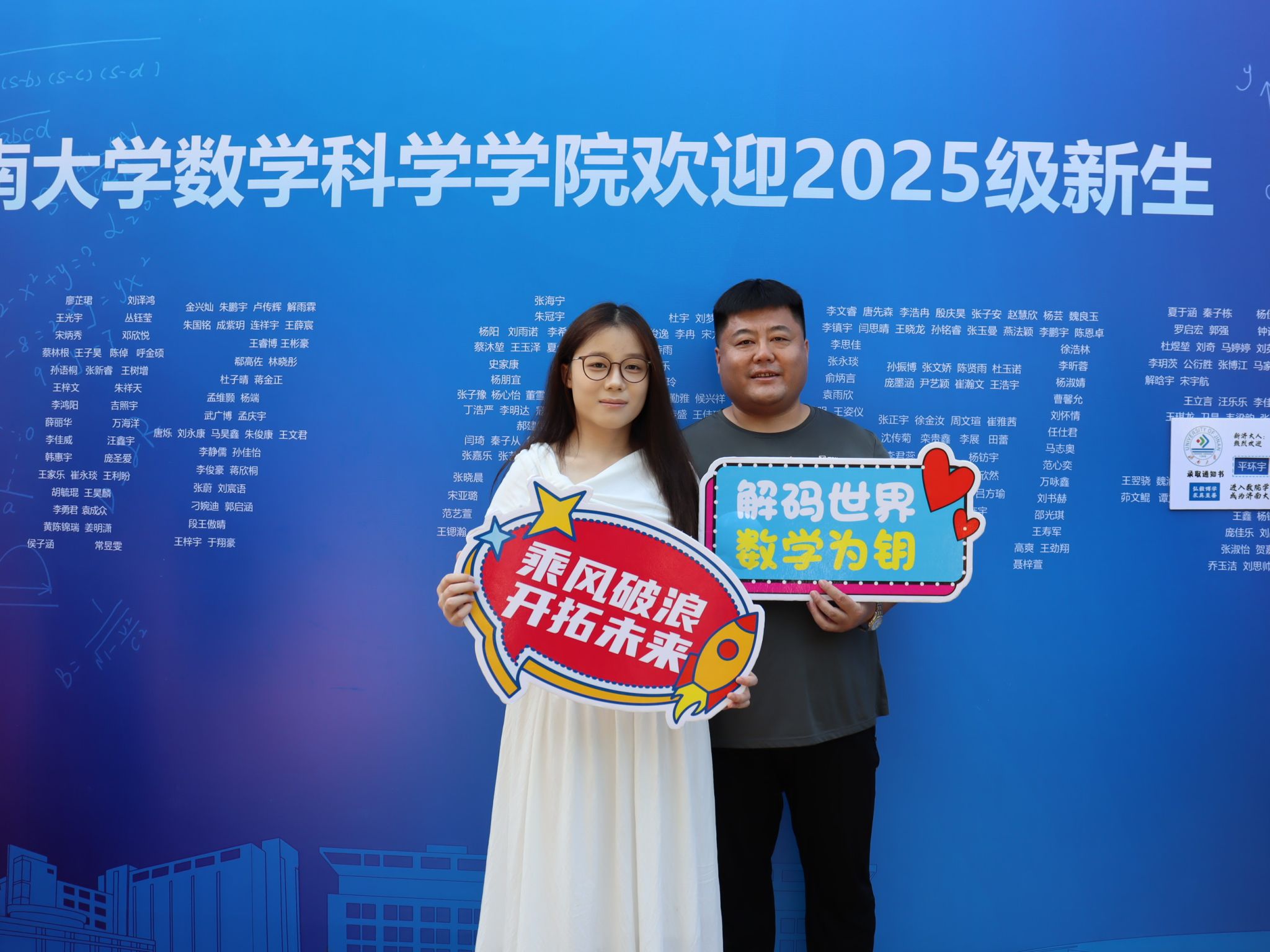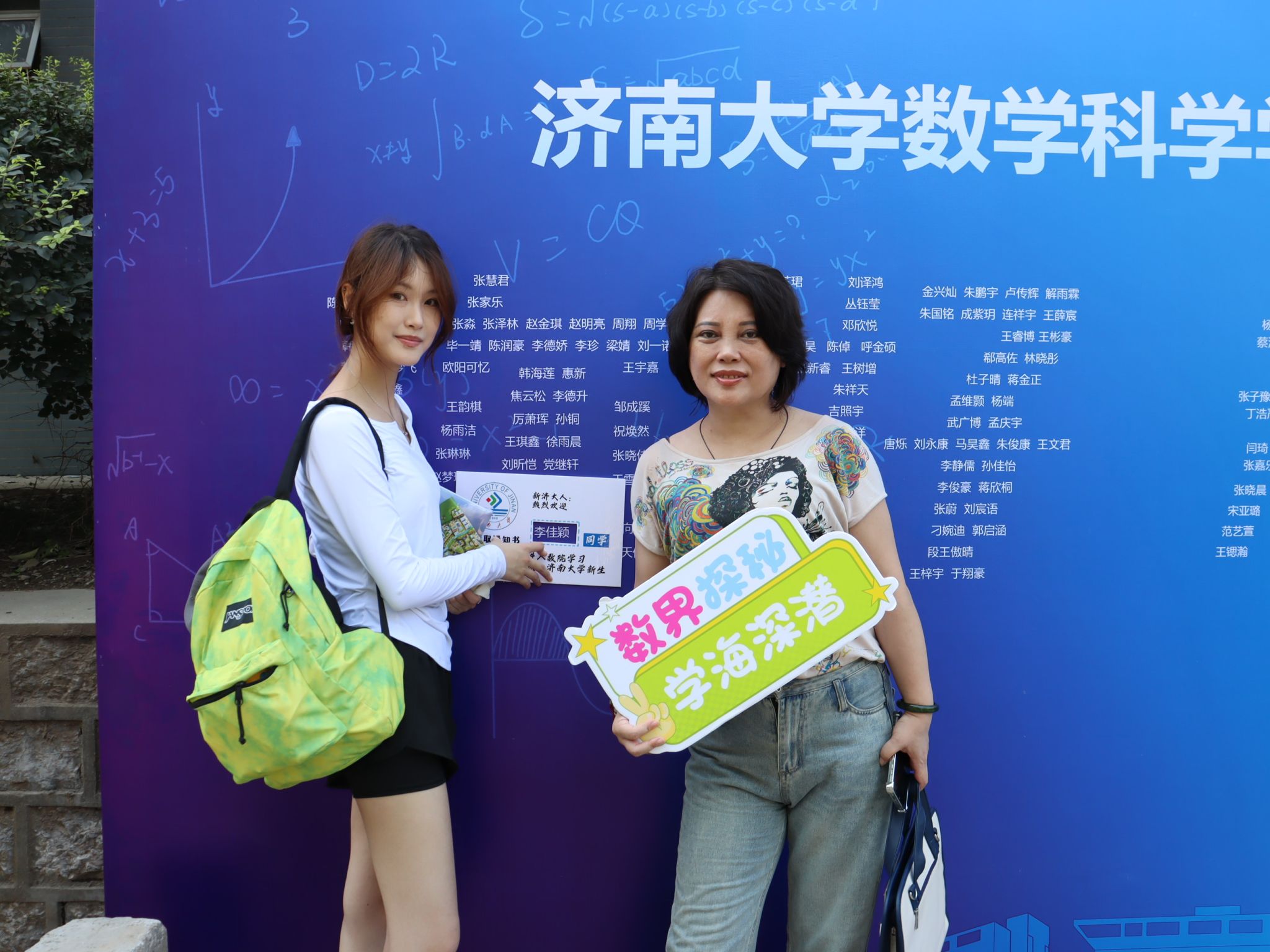 此次迎新活动,学院特别融入数学文化特色元素。在报到入口处,以数学公式、数学家名言设计的文化展板吸引众多新生驻足,在了解数学历史、感悟数学魅力的同时,激发新生对专业学习的热情。在互动区,专属姓名墙与创意标签别出心裁,留下初入校园的专属印记,并与姓名墙合影,定格与自慰高潮