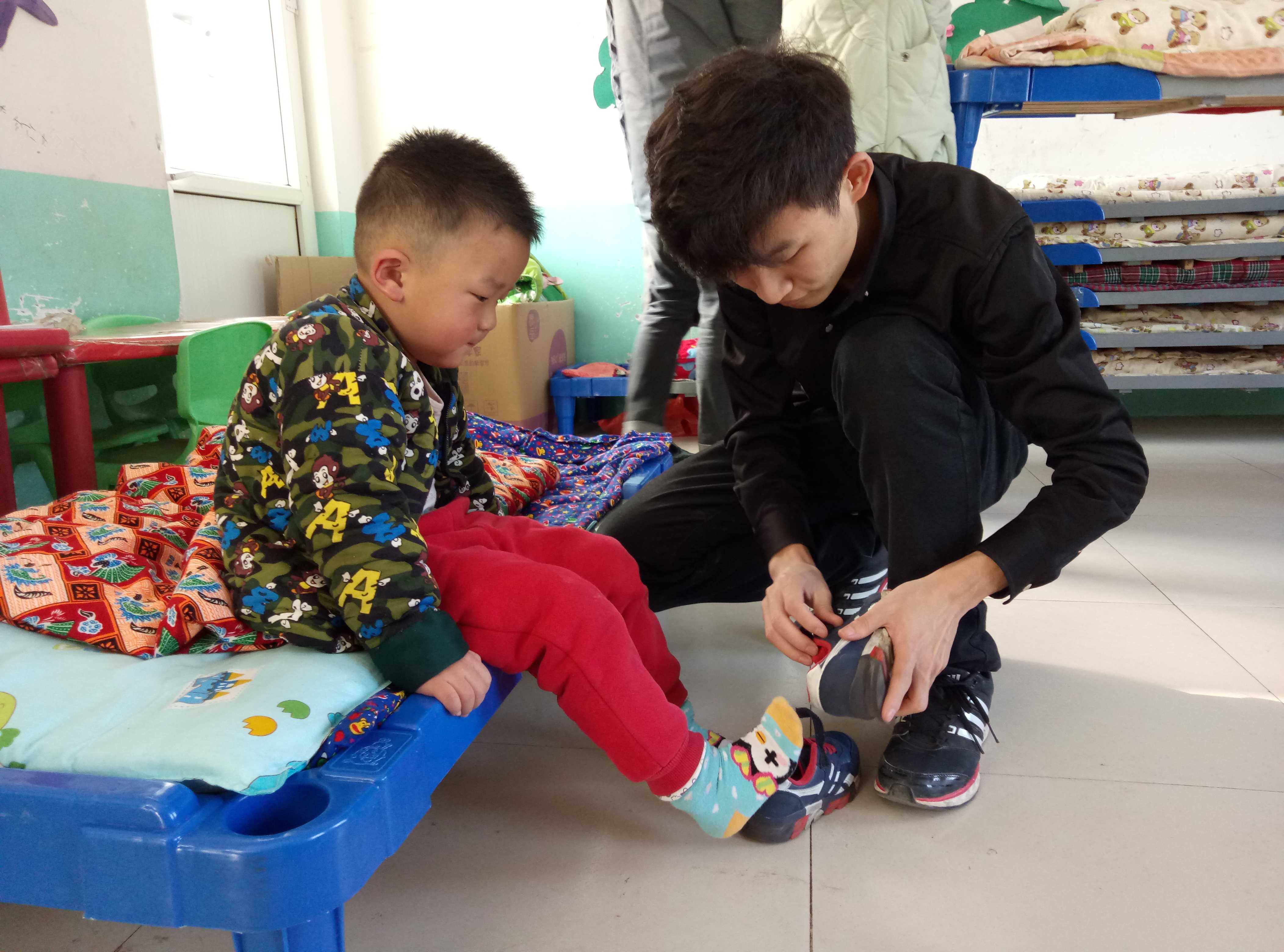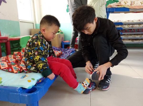 服务队刚来到后魏村幼儿园时,孩子们正在熟睡,在等待孩子们睡醒的期间,老师们给志愿者安排好了活动任务。活动伊始,志愿者们来到孩子们的教室,摆放好孩子们上课时用的桌椅,并且清理了桌面的垃圾,在他们的努力下,教室变得更加整洁敞亮。耐心得待到孩子们午休完毕,志愿者们来到孩子们的卧室,帮助孩子们穿上衣服和鞋子,整理床被,并把床排列整齐,重新摆放上干净整齐的桌椅。志愿者们做完这些工作后还陪同孩子们上楼去吃点心,和他们开心的交流玩耍。老师最后带领孩子们在院子里做游戏,志愿者们也都加入到游戏的行列中来,孩子们个个都积极踊跃参加,大家都玩得很尽兴,在他们的脸上都洋溢着快乐和幸福。志愿活动随着游戏的结束而结束了,志愿者们表示这样的活动很有意义,以后会常来参加。