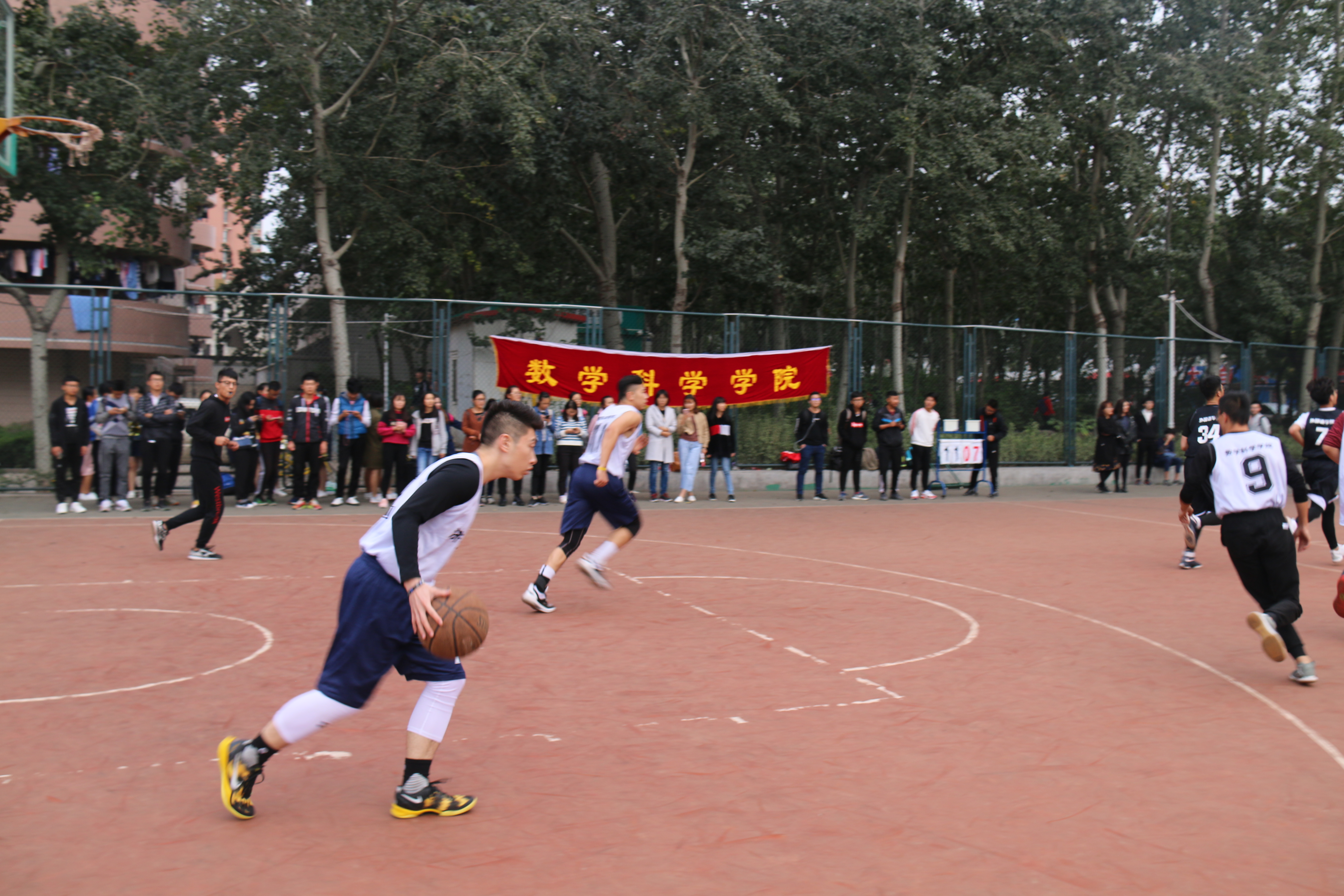 对阵外国语学院的比赛在学六篮球场隆重举行。到场人员有双方队员,学生会各位主席、部长及各院学生。