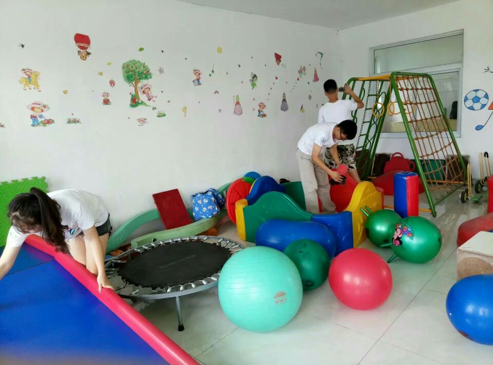 随后,四名同学作为助教进入班级辅助老师上课,其余四名同学帮助打扫内部卫生,收拾教学场地与健身器材。整个下午,志愿者们陪着小朋友们进行了各种游戏,沉醉在快乐里的小朋友们也终于时不时地露出了笑脸,志愿者们看在眼里,也不约而同地露出了会心的微笑。炎炎夏日,在志愿者同学们的劳动下,康复中心的卫生环境也焕然一新,为小朋友们的健身训练提供了方便。