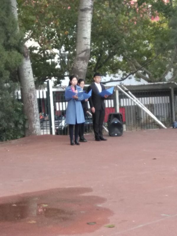 升旗开始前,全体新生伴着校歌整齐列队,肃穆站定。升旗仪式开始,国旗手迈着铿锵有力的步伐走向国旗,立定、稍息、敬礼等一系列动作规整有力,五星红旗在国旗手有力的臂膀下飞扬。伴着庄严的国歌,在场所有师生认真行注目礼,唱国歌,伴随着国旗的冉冉升起,大家心潮澎湃。随后,辅导员赵华磊老师进行发言,她鼓励新生们要端正学风,努力学习,为四年的大学生活打下坚实的基础,并希望大学生能够有所学,有所成。紧接,新生代表发言,他号召大家努力学习,警诫大家时间宝贵,要珍惜来之不易的大学生活。