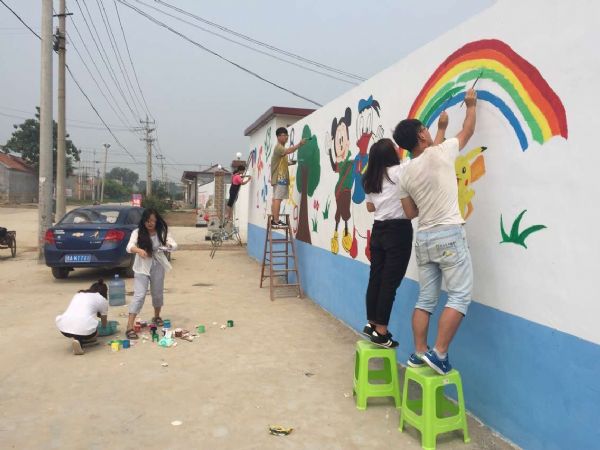 活动伊始,志愿者们用丰富的想象力构思了幼儿园门前的三面墙的图案,采用小朋友们喜欢的动画人物作为墙面的主要内容。志愿者们在村支书的带领下去镇里买了对小朋友无毒无害的丙烯颜料,回到村里,根据设计好的方案开始作画。村内出来玩耍的小朋友们也来帮助我们,一个个可爱的卡通形象和风景呈现在了幼儿园的外墙,幼儿园被志愿者们用画笔装点的缤纷多彩,路过的村民纷纷表示赞扬。