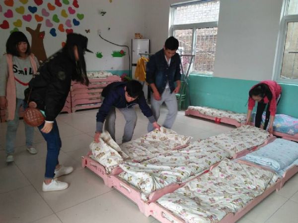 下午两点,志愿者们到达后魏村幼儿园,学校老师表示真挚欢迎。在老师的指引下志愿者们来到了教室,此时孩子们午休刚刚结束,见到志愿者们,孩子们十分高兴地欢迎大哥哥大姐姐们的到来。志愿者们首先帮助老师整理好孩子们的床铺,给他们整理好桌凳,然后安排他们坐到自己的座位上。随之志愿者们给小朋友分发了学习的资料,在教室和他们一起学习,一起动手制作,还做了有趣益智的小游戏。看到孩子们脸上洋溢着开心的笑容,志愿者们也十分欣慰。