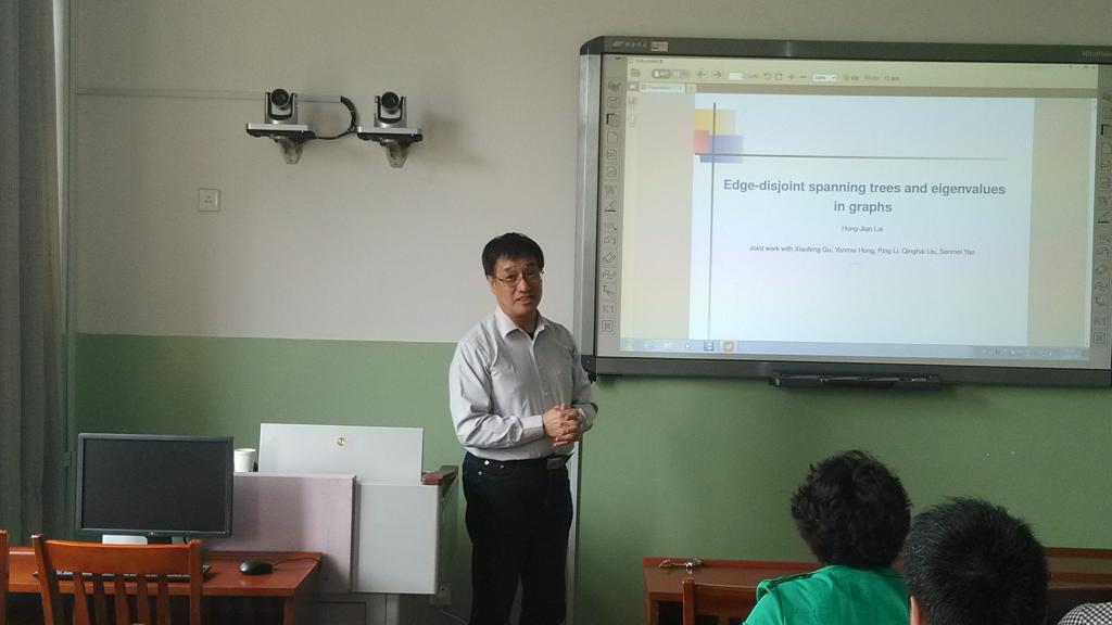 报告会上,赖虹建教授做了《图的边不交的支撑树与特征值》的报告。赖虹建教授从“图的边不交支撑树的个数与邻接矩阵特征值之间关系”的一个猜想出发,介绍了图的邻接矩阵、拉普拉斯矩阵和无符号拉普拉斯矩阵的概念和相关组合、代数方法,详细讲解了问题的研究思路和主要结果,并提出了进一步思考的一些问题。会后,自慰高潮