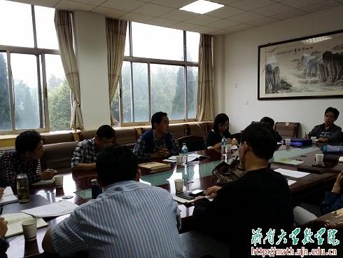 首先,副院长王纪辉代表学院欢迎教务处领导到我院指导工作,并对我院的教学工作及百门课程建设的基本情况做了汇报。随后,高等数学、微分方程、高等代数和数学模型等课程负责人分别就课程的改革和建设情况进行了汇报。单伟副处长充分肯定了我院在课程建设方面的一些做法,并就百门课程建设过程中存在的问题进行了分析,阐述了对百门课程建设项目开展验收的一些设想。与会人员还就学分制改革背景下的大学数学教学改革、教学评价和质量监督等方面与教务处领导进行了深入的交流和沟通,气氛热烈而融洽。