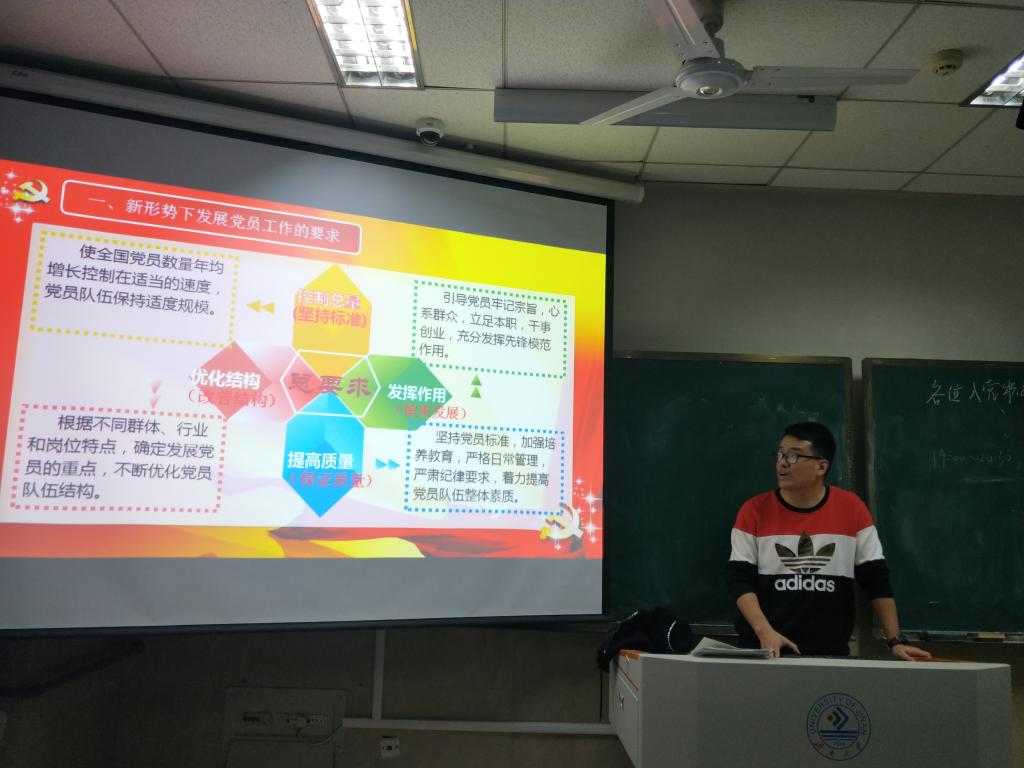 本次会议主要围绕入党条件进行分析。会议开始,吴老师主要从改善结构、坚持标准、慎重发展、保证质量四个方面表明了新形势下发展党员工作的要求,强调了发展党员程序和工作流程。随后,吴老师着重向大家讲解了如何填写信息,为自己的一举一动负责任,同时要有组织性、纪律性,保质保量的完成任务的积极观点。最后,吴老师对一些发展党员工作的注意事项进行了总结,着重强调了六次谈话、四次公示、三次备案的注意事项,希望各入党积极分子都可以认真对待。