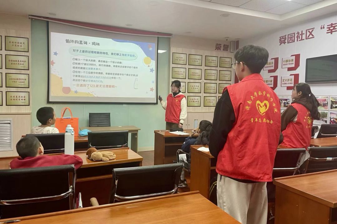 学生会青年志愿者协会组织志愿者于 3月1日在济南舜园社区开展趣味数学的授课活动。活动伊始,志愿者带领同学们玩起"遇7击掌"热身游戏,清脆的掌声与欢笑声瞬间点燃课堂,为这场思维探险注入满满活力。随后,志愿者通过兔子生崽趣味谜题引出斐波那契数列的奥秘,配合动画演示,使数列规律显然可见。此外,志愿者与同学们进行 “我会读心术”、“循环的黑洞” 等小游戏,将课堂气氛推向高潮,在欢乐中结束了本次趣味数学之旅.