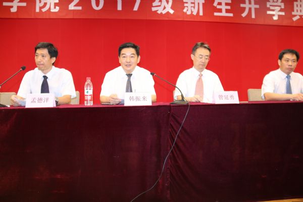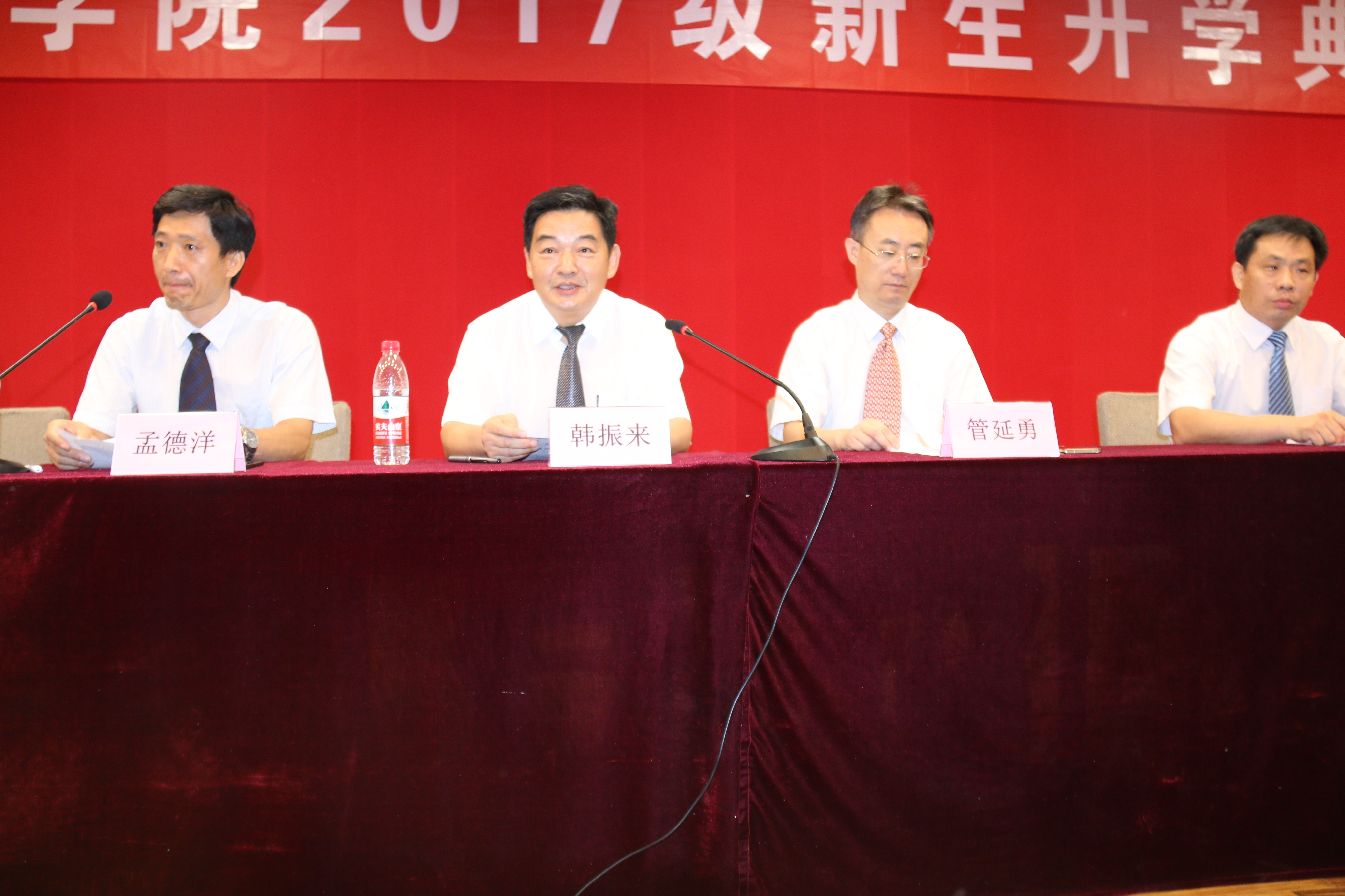 2017级新生开学典礼在学校第二学术报告厅隆重举行。学院党委书记韩振来,院长管延勇,党委副书记孟德洋、副院长王纪辉、王洪凯,数学与应用数学系主任吕洪波、信息计算科学系主任靳绍礼、金融数学系主任温凤桐、团委书记刘友谊、学办主任郭桂芬,以及辅导员、班主任、助理班主任等出席了此次开学典礼。典礼由党委副书记、副院长孟德洋主持。