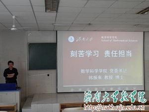 会议伊始,刘友谊老师强调了近期同学们在学习上应该注意的事项,并分别就考研、考公务员、就业给予了建议。紧接着,韩书记分析了现今考研和就业的形势,让同学们对自己的未来有了更深刻地认识。此外,韩书记还从“路就在脚下,自己去努力”、“打造属于自己的‘金刚钻’”、“担当责任,学会感恩”以及“谈谈金融与数学的关系”四个方面发表了讲话。讲话过程中,韩书记告诉同学们:“要想在社会上有自己的立足之地,必须在大学里锻炼自己的能力。在目前的就业形势之下,考研是一个高端就业延缓就业压力的好方法。同时,出国留学可以增长见闻,为将来创造更多的条件。在学习中,同学们要展现出愿意受教育的心态,不断克服困难、完善自我,担当起属于自己的责任。”随后,10级优秀毕业生陈东同学结合自己的亲身经历对就业问题给同学们展开详细讲解,。最后,来自财经通的两位指导老师针对在校期间金融数学专业学生们的考证问题提出了建议。听了老师们的讲解,同学们纷纷表示受益匪浅,此次会议圆满结束。