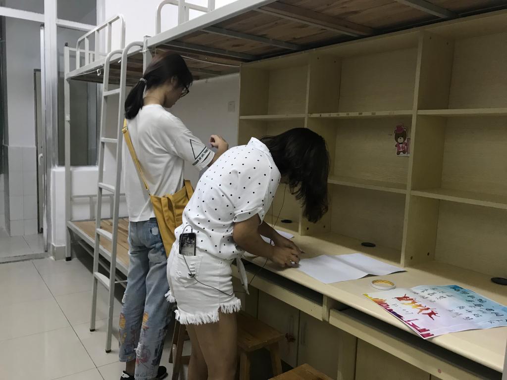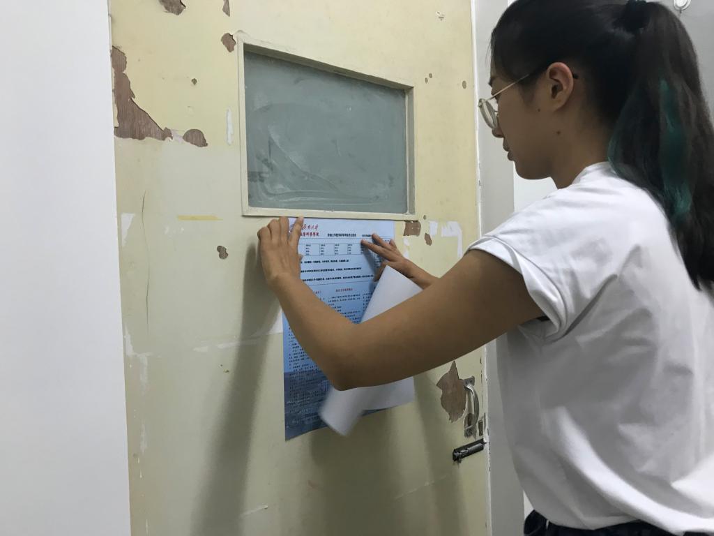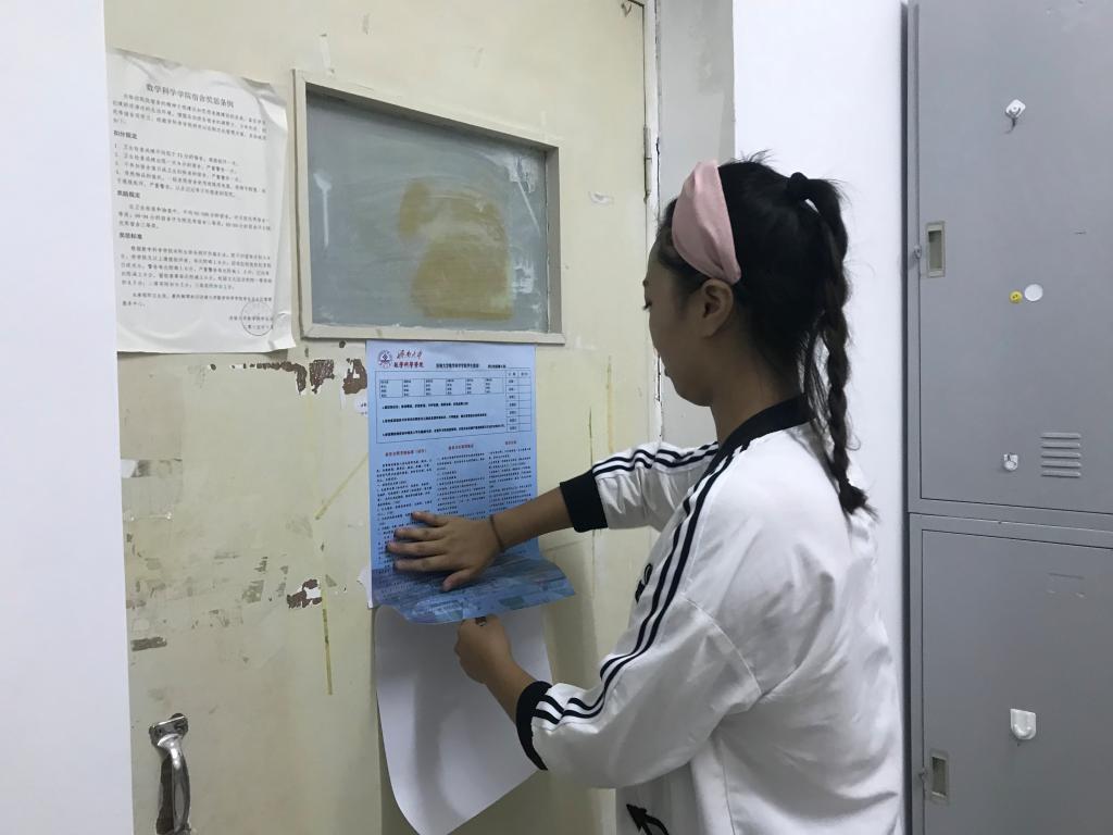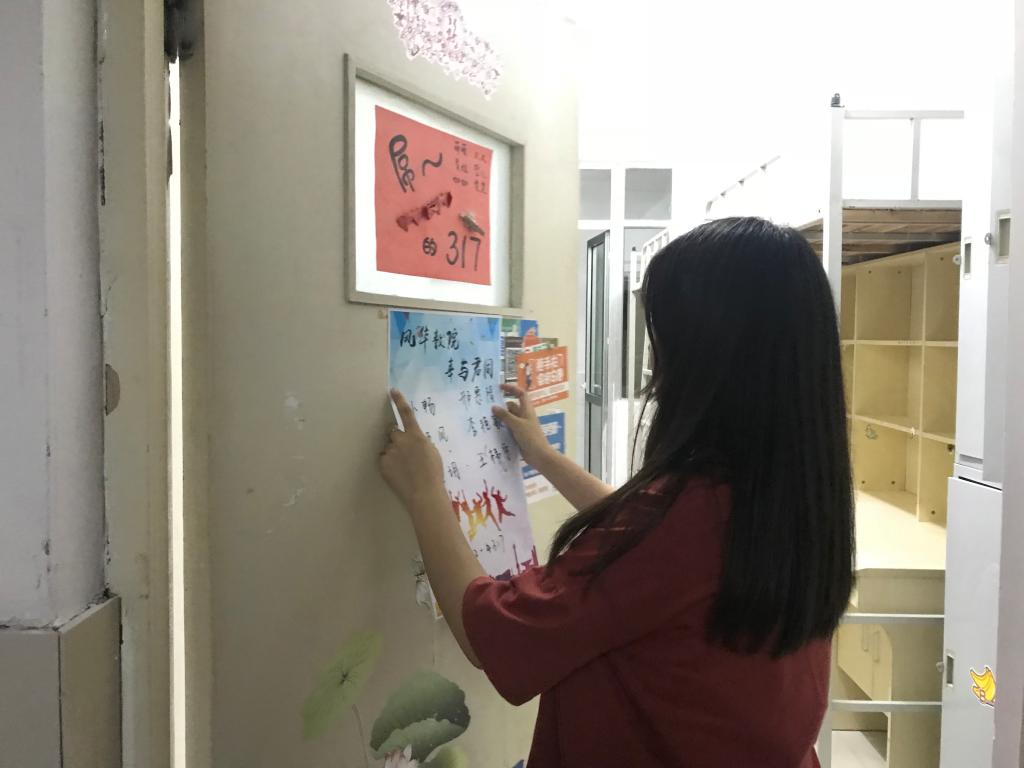 社管部工作人员和部分17级同学来到学生宿舍27号楼和32号楼,对新生宿舍进行卫生的打扫和门贴的张贴。