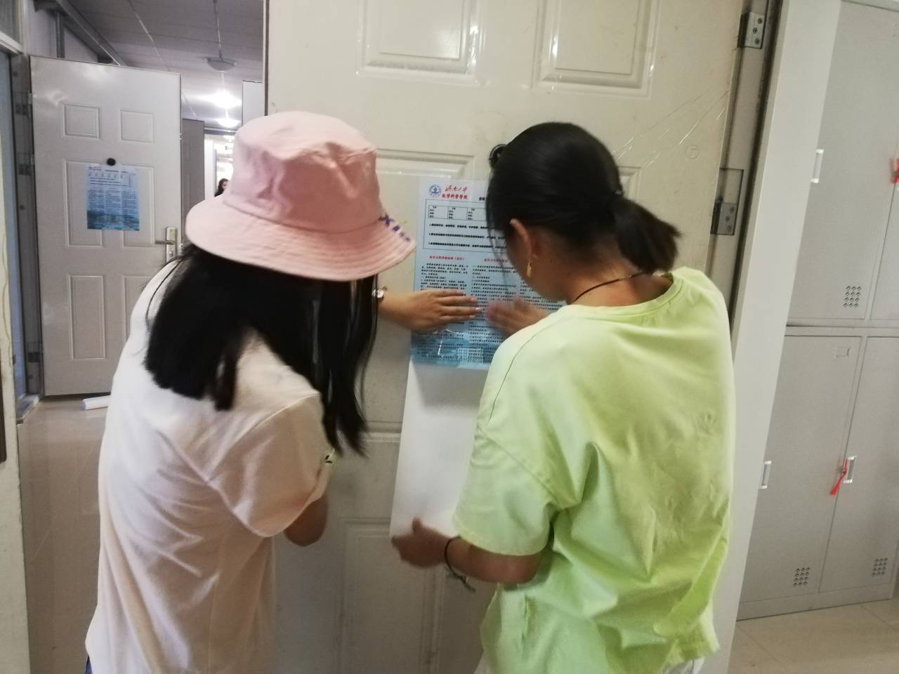 社管部与部分18级同学于8月29日来到新生宿舍楼,对新生宿舍进行卫生的打扫和门贴的张贴。