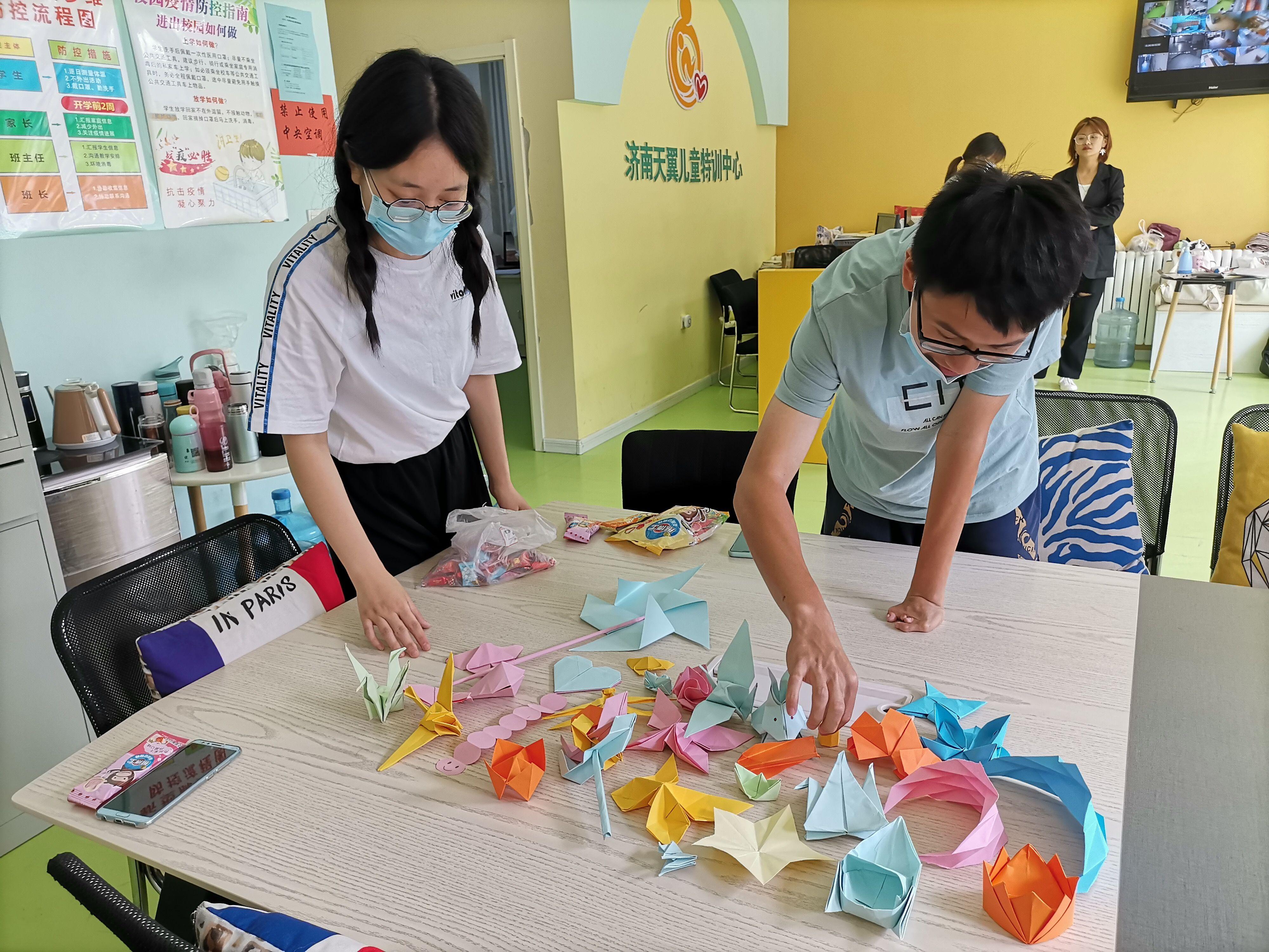下午一点,志愿者们准时来到了天翼儿童训练中心,康复中心的老师对志愿者们的到来表示热烈欢迎。随后,康复中心老师向大家介绍了活动的主要流程以及注意事项,志愿者们认真聆听并做记录。在康复中心工作人员的安排下合理有序的分配好工作,接着各位志愿者便满怀激情地忙起了自己的任务。志愿者们认真细致地打扫了孩子们的寝室、运动室、杂物室和训练室的每一个角落,无论是屋角还是门槽,都不留灰尘,他们又将活动室和个训室里的物品规整并摆放整齐,将走廊拖得干干净净,最后在临走前,为孩子们叠了许多精美的折纸。他们的辛勤劳动得到了老师们的认可,这次活动为孩子们提供了干净舒适的环境,帮助他们在他们一片洁净的环境中学习和成长,使孩子们感受到满满的关怀与温暖。活动结束后,志愿者们依依不舍的离开,并都希望有机会能再来参与活动,为孩子们献出自己的一份温暖与爱心。