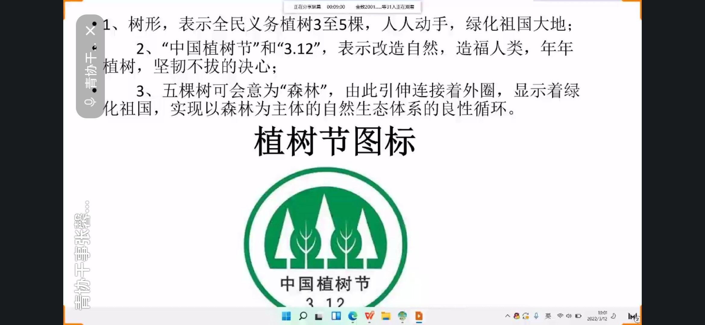 因疫情原因,此次活动采取线上方式进行。活动开始,负责人员先为同学们讲解了植树节的由来以及与之相关的法律法规,并介绍了该节日的起源自孙中山先生的倡导,让同学们对植树节的历史有了更加深入的了解。同时,负责人通过列举植树节邮票的来历以及历史上美国内布拉斯州的环境改善说明了植树节的重要意义。随后主讲人向大家展示了我国的植树节图标,讲解了植树节图标所蕴含的深远意义。活动最后,负责人向大家展示了我国历经几十年不懈努力积极植树造林后环境的改善以及林业资源的发展,据此向同学们发出积极倡导,倡导同学们保护环境,爱护树木。至此,本次活动圆满结束。