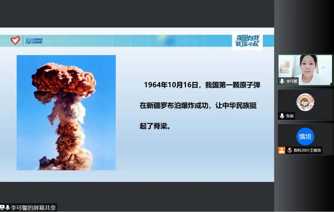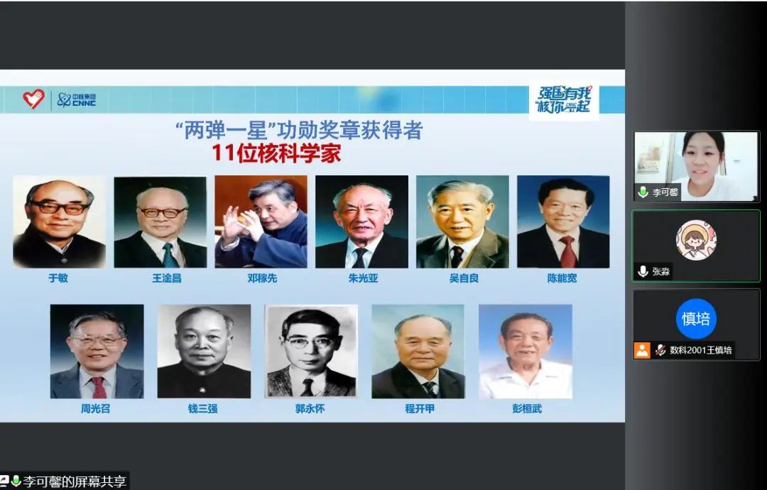 本期宣讲活动由李可馨同学主持。首先,她介绍了我国核工业发展的三个30年的发展历程,系统阐述了每个30年中我国取得的重大成就以及重要贡献人物。从中央政府决定发展原子能工业到“五厂三矿”的形成,再到我国第一颗原子弹爆炸成功,第一个30年孕育了伟大的两弹一星精神;党的十一届三中全会后,中国核工业做出了“保军转民”的战略调整,自行设计了首座核电站,第二个30年孕育了“四个一切”核工业精神;“华龙一号”建成,核电走出国门,第三个30年孕育了新时代核工业精神。核工业人以“强核强国、造福人类”为己任,青年更应追寻前辈足迹,传承强核强国使命。
