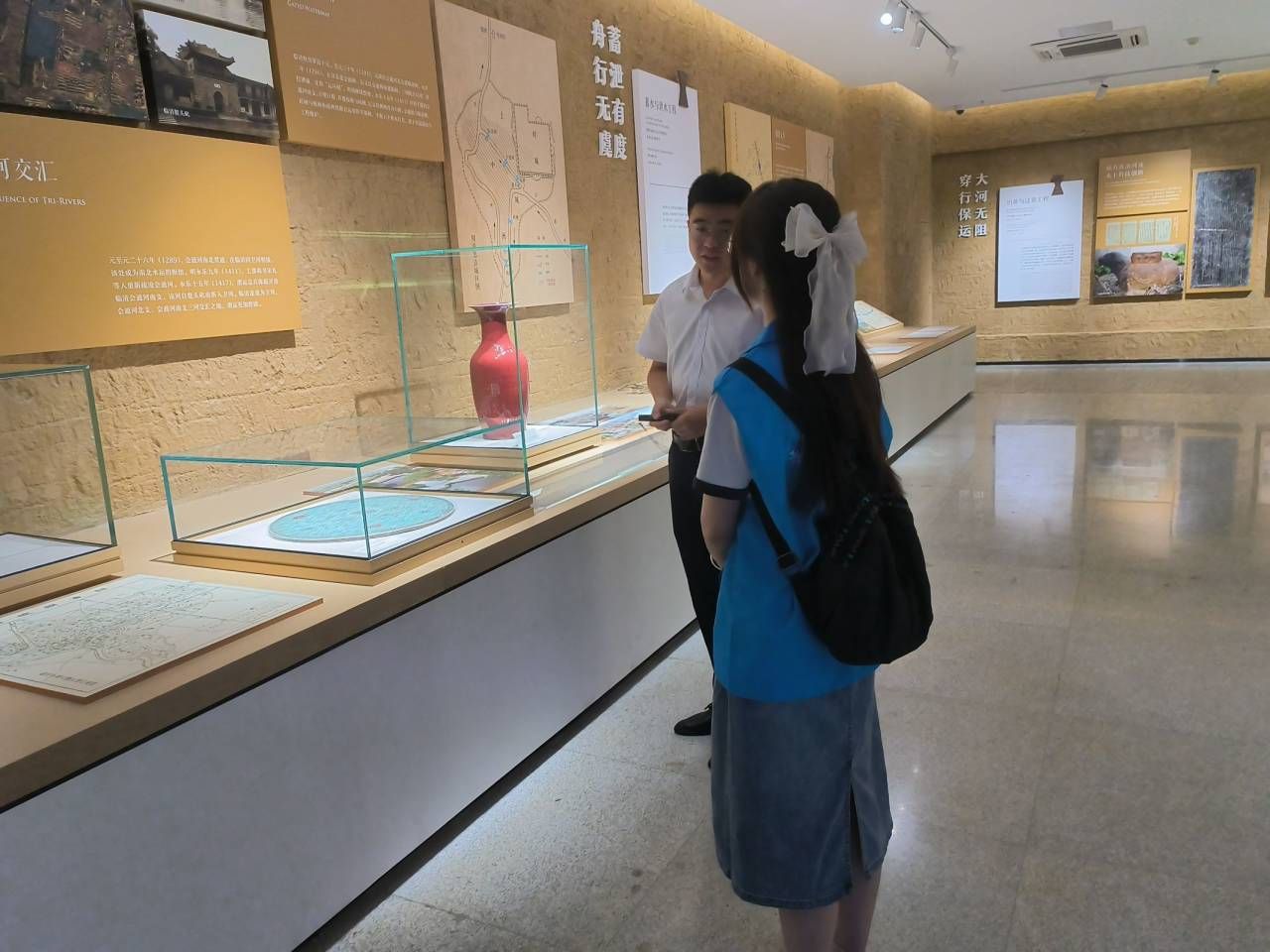 7月20日,实践队前往中国运河文化博物馆进行调研活动。工作人员将京杭大运河水文化知识分为地理、历史、治理等方面进行讲解,生动地讲述了京杭大运河的演变及其对沿岸地区的影响,在工作人员讲解下,实践队初步掌握了京杭大运河的历史和发展、对沿岸地区经济和政治的影响以及运河在现阶段发挥的作用等方面的知识。在有了一定的理论基础后,实践队前往水城广场,向广场上的市民发放调查问卷,初步了解市民们对运河水文化的认识,并向市民们讲解问卷中的有关运河水文化方面的知识,提高公众保护运河、保护水环境的意识。同时实践队向老人们询问运河沿岸的风俗习惯和民间信仰,聆听老人们讲老一辈们的故事,对运河在沿岸地区思想文化方面的影响有了更深地掌握。