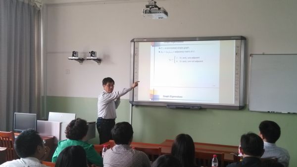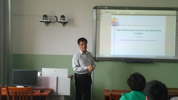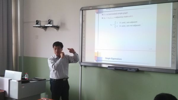 报告会上,赖虹建教授做了《图的边不交的支撑树与特征值》的报告。赖虹建教授从“图的边不交支撑树的个数与邻接矩阵特征值之间关系”的一个猜想出发,介绍了图的邻接矩阵、拉普拉斯矩阵和无符号拉普拉斯矩阵的概念和相关组合、代数方法,详细讲解了问题的研究思路和主要结果,并提出了进一步思考的一些问题。会后,自慰高潮