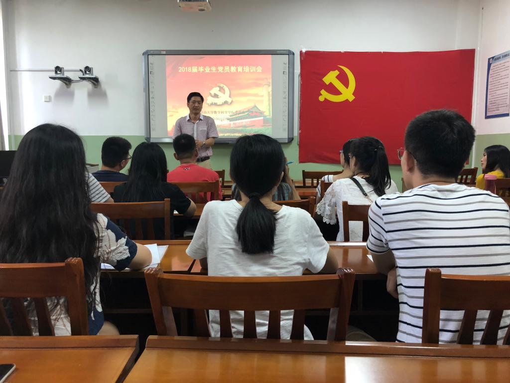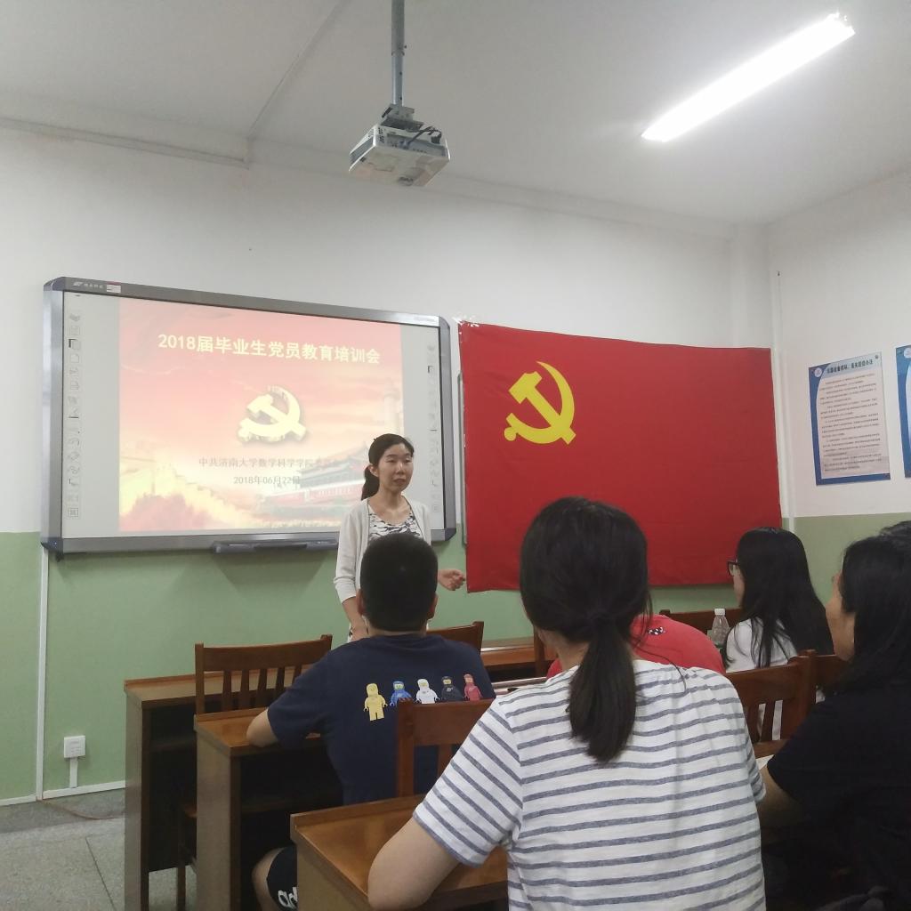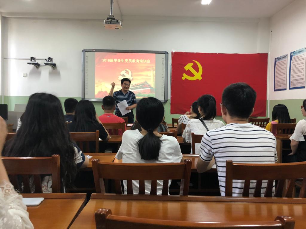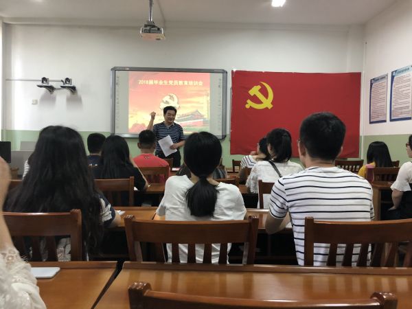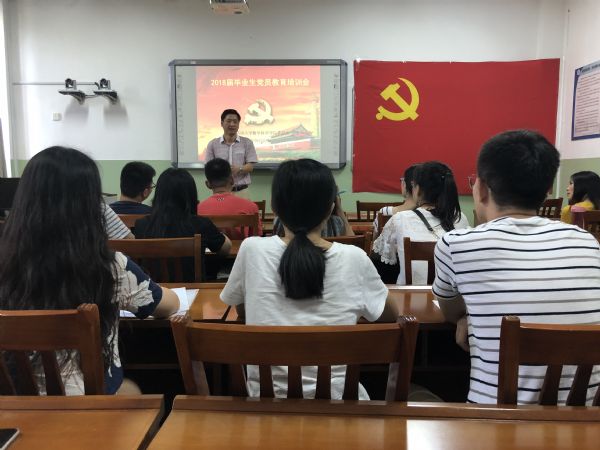 党委书记韩振来,党委副书记孟德洋老师主讲,2016级辅导员赵华磊老师和2018届全体毕业生党员参加。