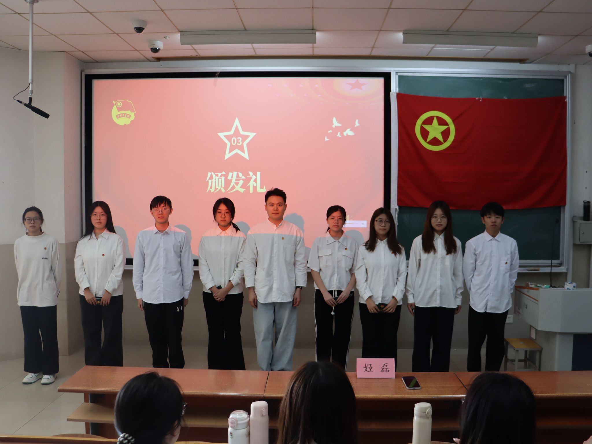 姬磊宣读了新团员名单,并为新团员佩戴团徽、颁发团员证。随后,在领誓人赵卓娅的带领下,新团员面向团旗庄严宣誓。